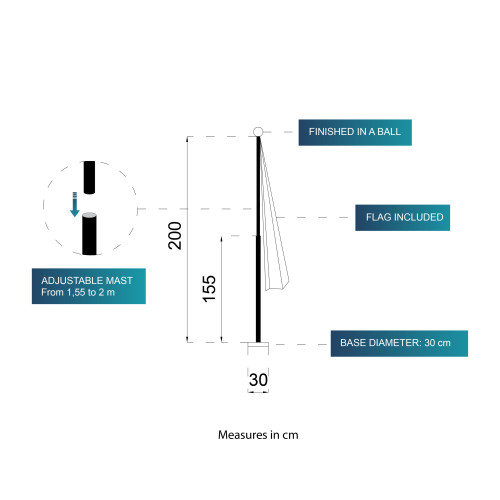 Suorakaiteen muotoinen lippu, joka on vaakasuorassa ja jonka mitat ovat 1,5 metriä leveä x 1 metri korkea (1,5 x 1 m). Tangon korkeus on säädettävissä 155 cm:stä 200 cm:iin, ja sen ulkohalkaisija on 3,5 cm.
