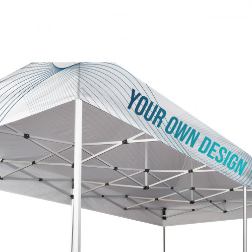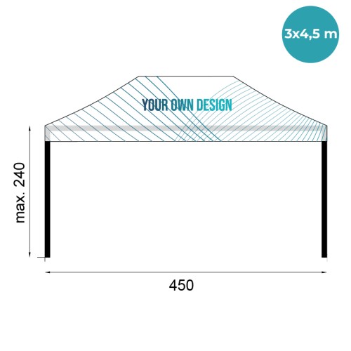 3 x 4,5 m Telt. Stoffdesignet på våre telt kan tilpasses 100 % på utsiden av teltet. Det er mulig å designe taket, de fire sidekappene og de fire mulige veggene (selges separat) med farger eller bilder etter kundens ønske. På denne måten kan strukturen gjenbrukes og tekstildekselet byttes ut til andre anledninger. Hele teltstrukturen er vanntett og designet for å kunne foldes sammen til et lite volum for enkel oppbevaring.