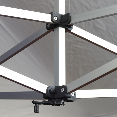 Rammen til reklameteltet består av et leddet rammeverk av sekskantede aluminiumrør, matt metallisk grå i fargen og sammenføyd med nylonskjøter. Denne sammensetningen gir dem stor holdbarhet og samtidig letthet.