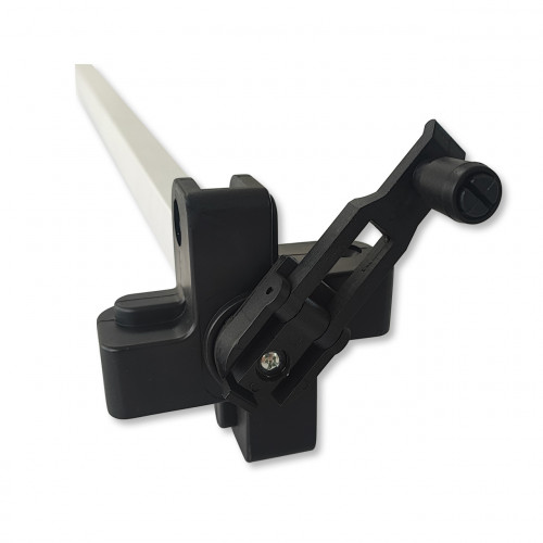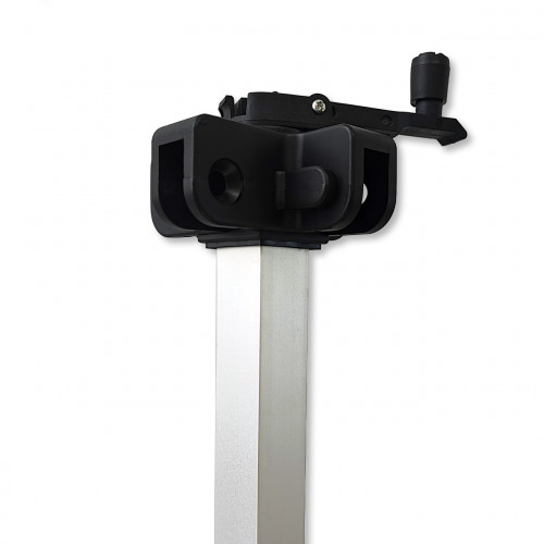 Reservesveivhåndtak til telt. Den er smidd av aluminium i grå metallic og består av en 25 mm firkantet seksjon med håndtak i svart herdet plast øverst.