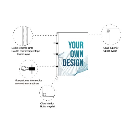 Vertical flag with customisable dimensions. Maximum dimensions The maximum area of the flag may not exceed 144 square metres. Important: Due to the high temperatures of the sublimation process, the flag fabric may shrink by up to ±5%. |