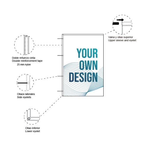 Rektangulært flagg laget vertikalt i polyesterstoff. Det har løpegang etter eget valg (lukket øverst, med mulighet for å legge til en åpen nederst), forsterkningsbånd og maljer på venstre side hver 100 cm, noe som gjør det enkelt å montere. Takket være sammensetningen kan det brukes både innendørs og utendørs. Flagget brukes vanligvis på høye master, slik at det foldes helt ut og viser budskapet i sin helhet.