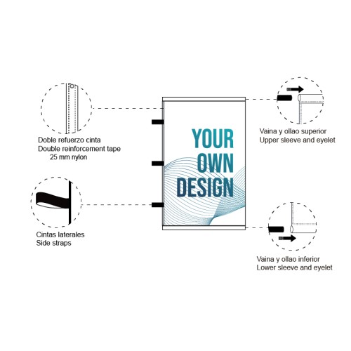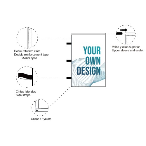 Pod The sheath of the flag is made according to the width of the product. Sleeve closed at the top. Reinforcement tape, 2 eyelets and ties to encircle the mast on the left side (mast not included). Sleeve closed at the top and bottom. Reinforcement tape, 2 eyelets and ties to go around the neck on the left side (mast not included). |