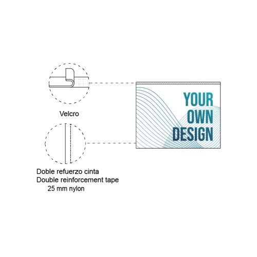 Rektangulært flagg laget av polyesterstoff. Det har borrelås av "hun"-typen sydd rundt hele kanten. "Hann"-delen leveres separat for enkel montering på ulike overflater. Du kan velge bredde og høyde etter ønskede mål. Flaggets tekstiloverflate kan tilpasses med farger og/eller design etter eget ønske.