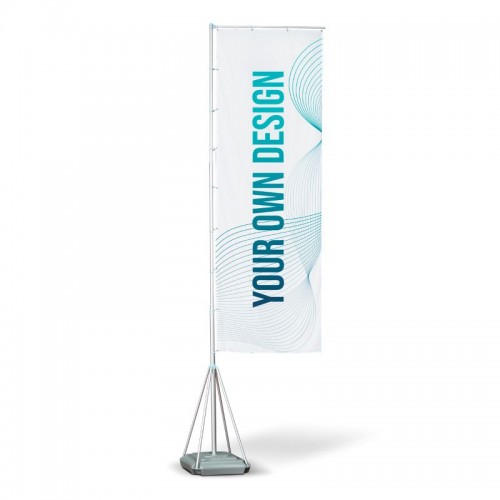 Flag: customisable colours and designs. Colour of flagpole: matte silver grey. Accessories and finishes: blue / light grey, depending on availability. Base colour: dark grey. Eyelets: gold-plated |