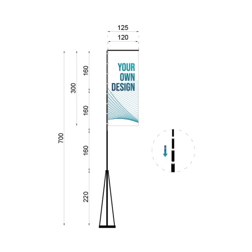 Printed flag 3 metres high and 1.20 metres wide. Main telescopic flagpole: Height: Adjustable from 5 to 7 metres. Height when collapsed: 2.2 metres. Diameter: - 5.5 cm for the segment closest to the base. - 3 cm at the top. - Flag arm (horizontal segment) that is 1.25 m long and has a diameter of 2 cm. Base: 70 cm long, 70 cm wide and 20 cm high. Large double ring: Largest outside diameter: approx. 6 cm. Smaller diameter: 2.5 cm. Small double ring: Outer diameters: approx. 2.5 cm. Eyelets of 1 cm inner diameter. |