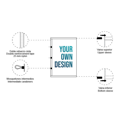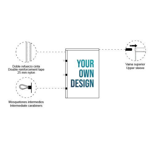 Com bainha superior e/ou superior e inferior. Cinta de reforço e mosquetões no lado esquerdo a cada 100 cm. Mosquetão com 4,5 cm de altura e 2,5 cm de largura. Bainha A bainha da bandeira é feita para se adaptar à largura do produto. |