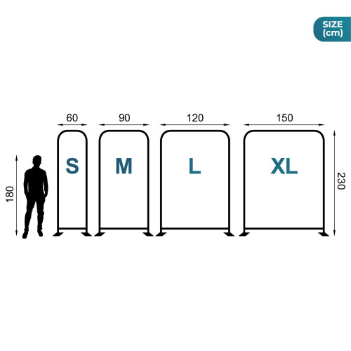 Estão disponíveis quatro tamanhos. Com uma largura entre 60 e 150 cm e altura fixa de 230 cm, para que possa escolher o que melhor se adapta às necessidades do seu cliente.